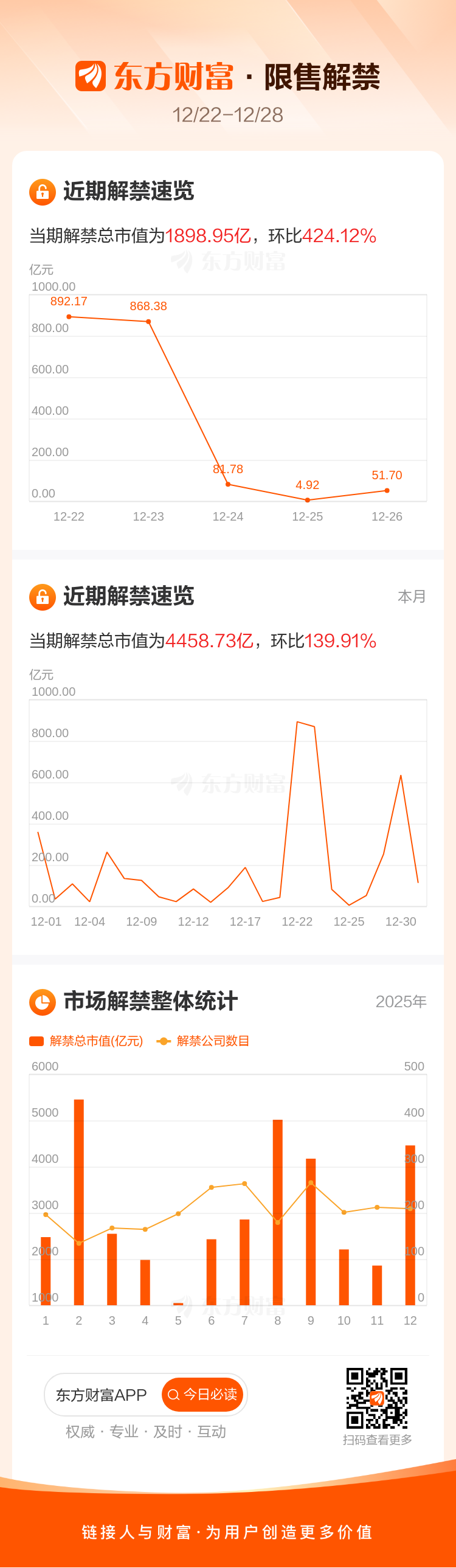 下周(12月22日至12月28日)有59家公司限售股陆续解禁,当期解禁总市值为1898.95亿元,环比424.12%。