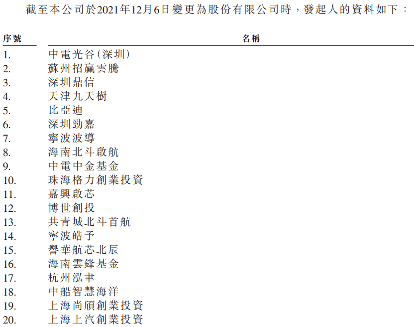 招股书显示,公司发起人包括中电光谷(深圳)、深圳鼎信、比亚迪、深圳劲嘉、宁波波导、海南北斗启航、珠海格力创业投资、海南云峰基金、上海上汽创业投资等。