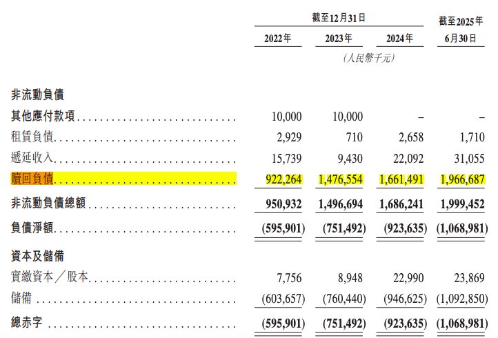 值得关注的是,截至2025年6月30日,公司资产负债表上录有高达19.67亿元的赎回负债。而高昂的赎回负债利息严重拖累了公司盈利表现。2024年,公司财务成本高达1.002亿元,其中绝大部分来自赎回负债的利息。