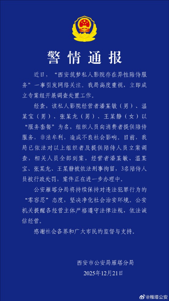 西安市公安局雁塔分局12月21日发布情况。近日,“西安筑梦私人影院存在异性陪侍服务”一事引发网络关注。我局高度重视,立即成立专案组开展调查处置工作。