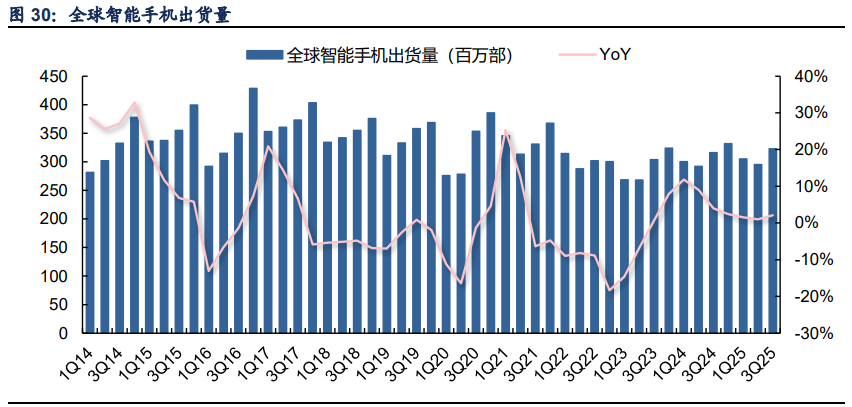 全球智能手机市场在经历调整后迎来温和复苏,AI 成为激发换机需求的关键变量。随着宏观经济环境的改善及渠道库存的去化,全球智能手机出货量已重回增长轨道。展望 2026 年, 虽然整体市场规模主要呈现存量博弈特征,但 AI 手机的结构性机会不容忽视。各大手机品牌厂商纷纷将生成式 AI 作为旗舰机型的核心卖点。