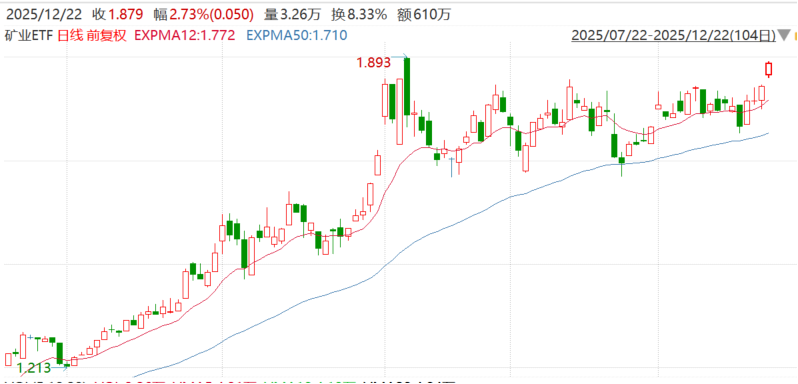 12月22日,A股有色金属板块午后持续走强,白银有色涨停,中钨高新涨超9%,云南锗业、湖南白银、西部黄金、紫金矿业、中金黄金、赤峰黄金跟涨。矿业ETF(159690)涨2.73%。