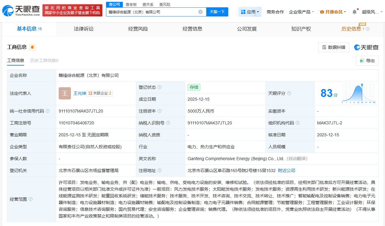 南方财经12月22日电,天眼查工商信息显示,近日,赣锋综合能源(北京)有限公司成立,法定代表人为王光坤,注册资本5000万人民币,经营范围包括发电技术服务、资源再生利用技术研发、新兴能源技术研发、储能技术服务等。股权全景穿透图显示,该公司由王光坤、赣锋锂业(002460)旗下赣锋综合能源(青海)有限公司共同持股。