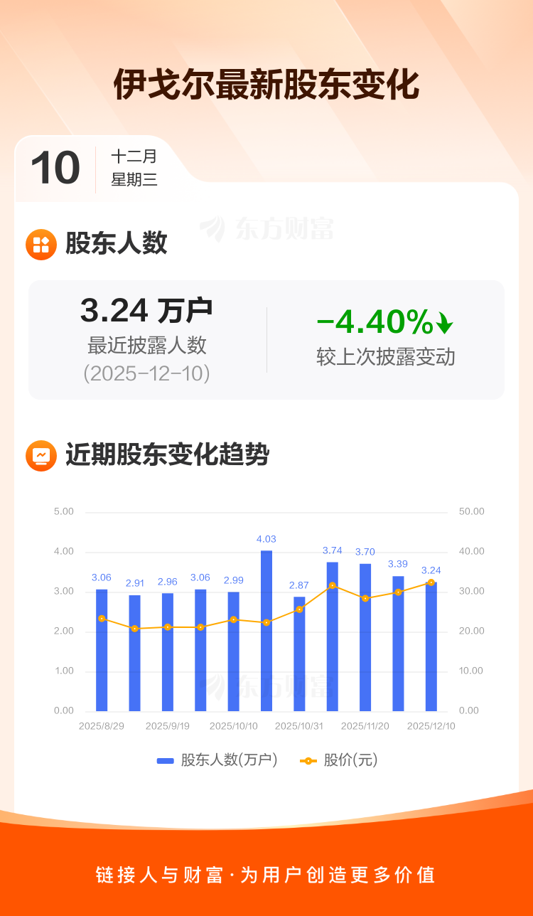 伊戈尔:截至12月10日最新股东户数3.24万户,较上期减少4.40%