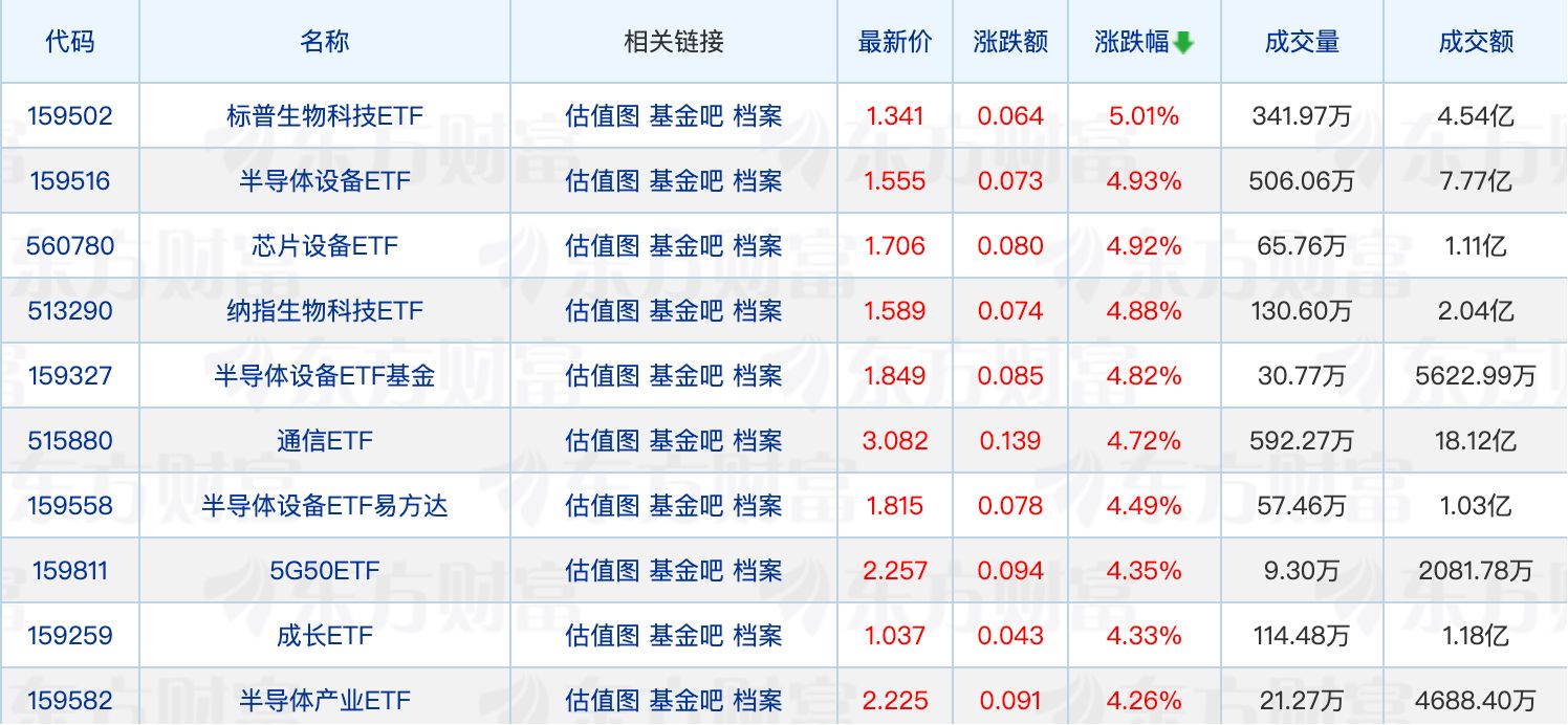 具体来看,标普生物科技ETF领涨5.01%,半导体设备相关ETF集体反弹。