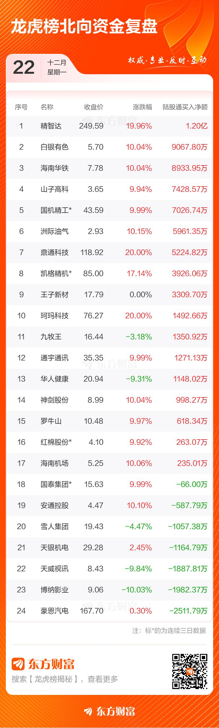 12月22日龙虎榜复盘:“深南东路”2.16亿元净买入山子高科