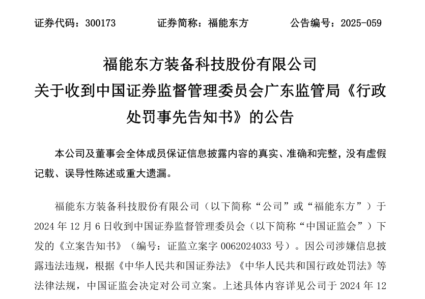 福能东方的违法事实主要涉及其原子公司大宇精雕。2020年6月,大宇精雕与重庆中光电合谋,通过虚假货款支付和虚构采购业务的方式进行资金循环:先由重庆中光电向大宇精雕支付虚假货款,形成虚增应收账款;随后大宇精雕以预付款形式将资金转回对方,虚增资产并少计提减值损失。该操作导致福能东方2020年度虚增利润3580万元,占当年披露利润总额的120.18%;2021年因对虚增款项确认减值,又造成利润虚减2265万元,占当年利润总额的6.64%。上述行为致使公司2020年、2021年年度报告存在虚假记载,违反了《证券法》第七十八条第二款的规定,构成第一百九十七条第二款所述的信息披露违法行为。依据相关法律规定,广东证监局拟决定:责令福能东方改正,给予警告,并处以650万元罚款。