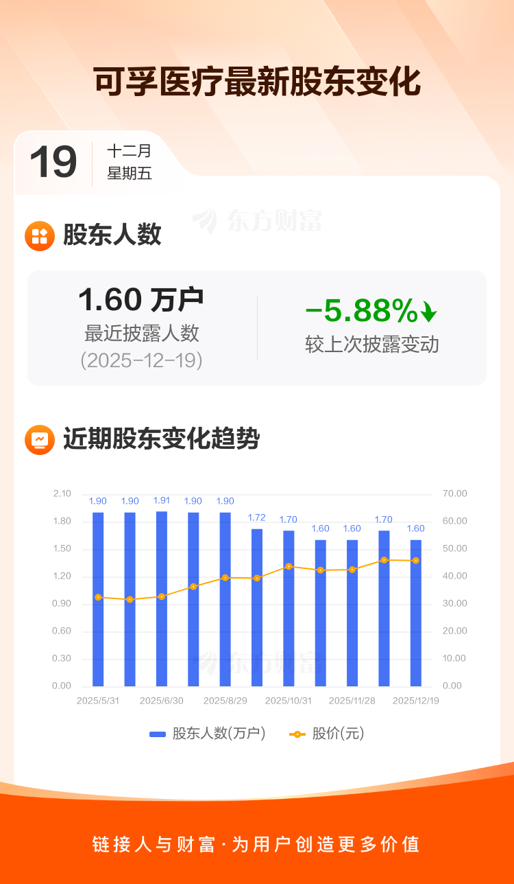 可孚医疗最新披露数据显示,截至12月19日公司股东户数为1.60万户,较上期(2025年12月10日)减少1000户,降幅为5.88%。户均持有流通股数量由上期的1.14万股上升至1.21万股,户均持股金额由上期的52.58万元增加至55.64万元。