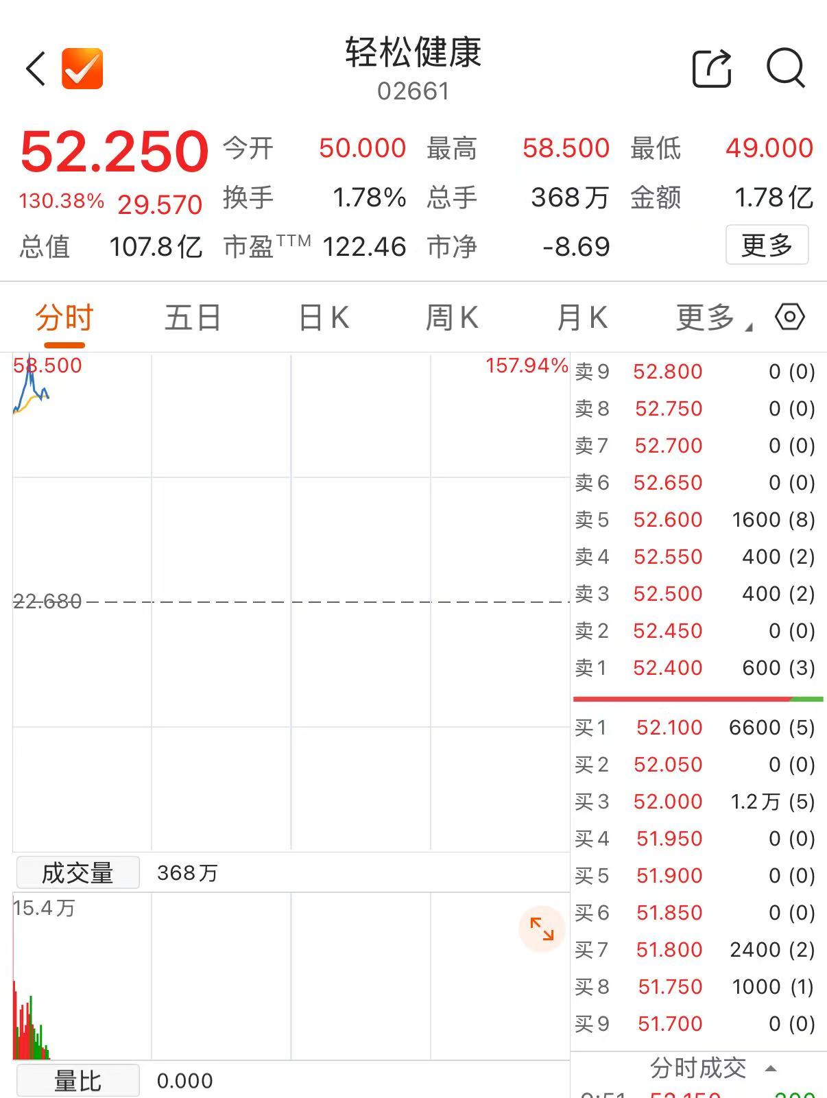 上证报中国证券网讯(记者徐潇潇)12月23日,轻松健康正式登陆港交所。上市首日,该股开盘报50港元/股,盘中一度涨超150%。截至9时51分,轻松健康涨130.38%,报52.25港元/股。