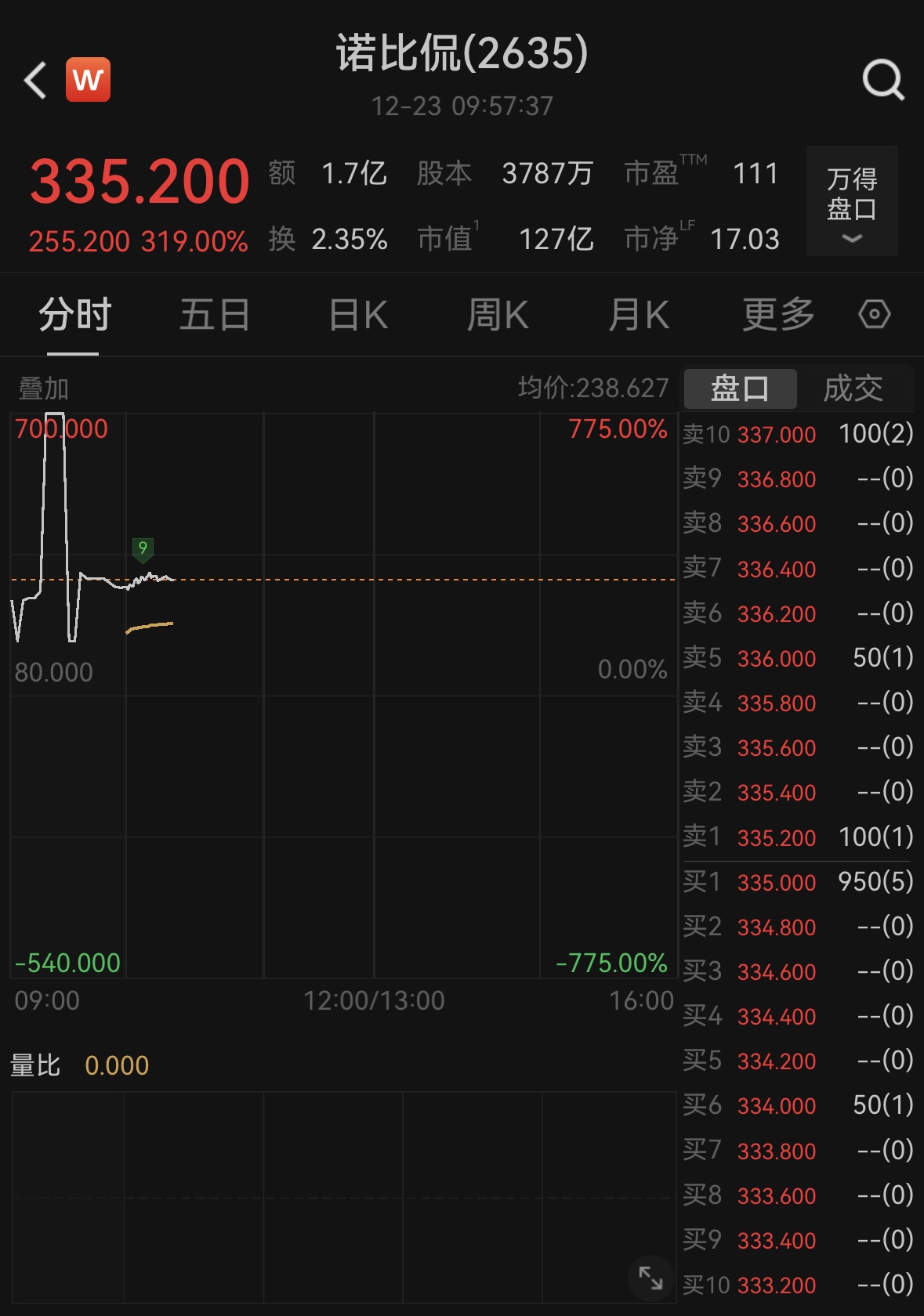 上证报中国证券网讯(记者何漪)12月23日,诺比侃在港交所挂牌上市。截至9点57分,诺比侃大涨319%,报335.2港元/股。