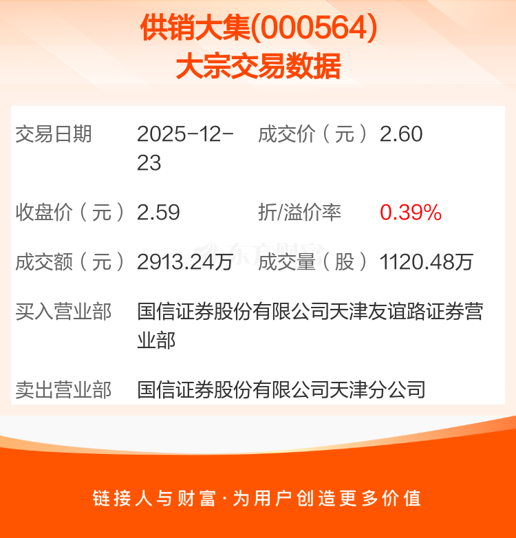 2025年12月23日,供销大集发生1笔大宗交易,共成交1120.48万股,成交金额2913.24万元,占其流通市值比例为0.08%。
