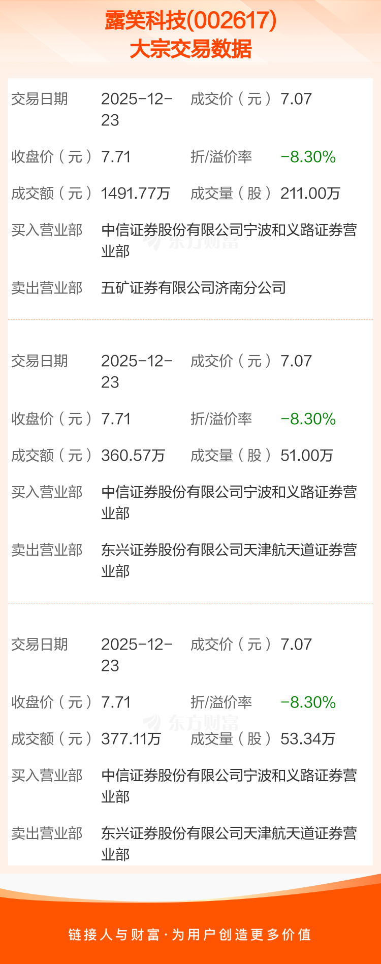 3笔大宗交易成交均价7.07元,较该股当日收盘价7.71元折价8.30%。