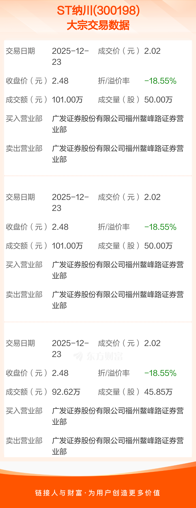 2025年12月23日,ST纳川发生3笔大宗交易,共成交145.85万股,成交金额294.62万元,占其流通市值比例为0.12%。