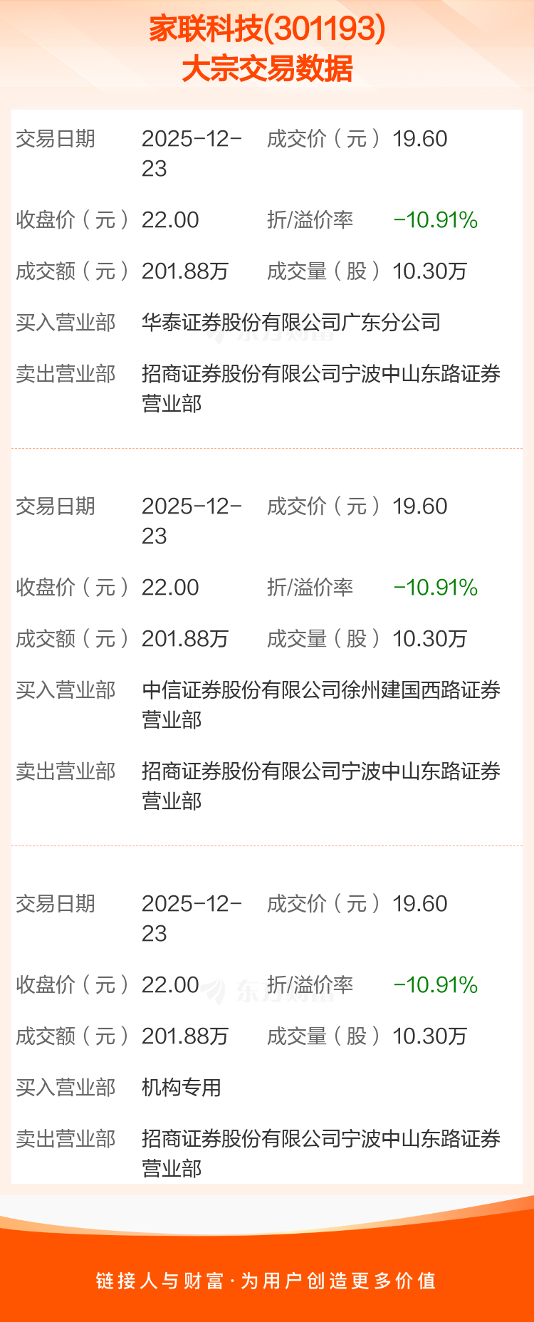 2025年12月23日,家联科技发生3笔大宗交易,共成交30.90万股,成交金额605.64万元,占其流通市值比例为0.20%。