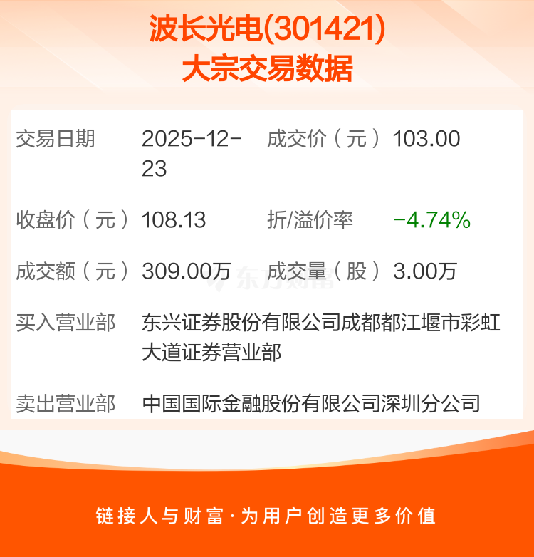 2025年12月23日,波长光电发生1笔大宗交易,共成交3.00万股,成交金额309.00万元,占其流通市值比例为0.06%。