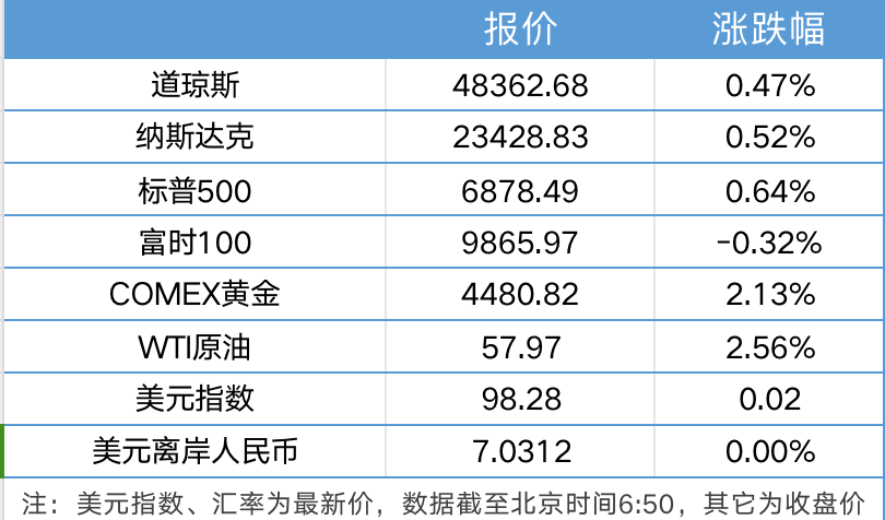1、美股三大指数集体收涨,标普500指数涨0.64%,纳指涨0.52%,道指涨0.47%;大型科技股涨跌不一,特斯拉、英伟达涨超1%,谷歌、亚马逊、Meta小幅上涨;英特尔、奈飞跌超1%,苹果、微软小幅下跌;第一太阳能涨超6.6%,创2024年6月份以来收盘新高;花旗集团涨近3%,股价创17年多新高。