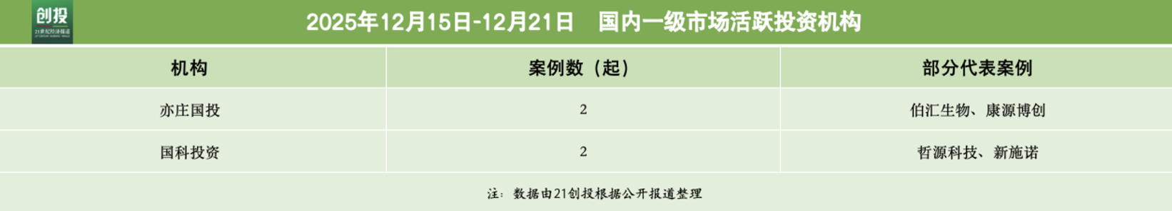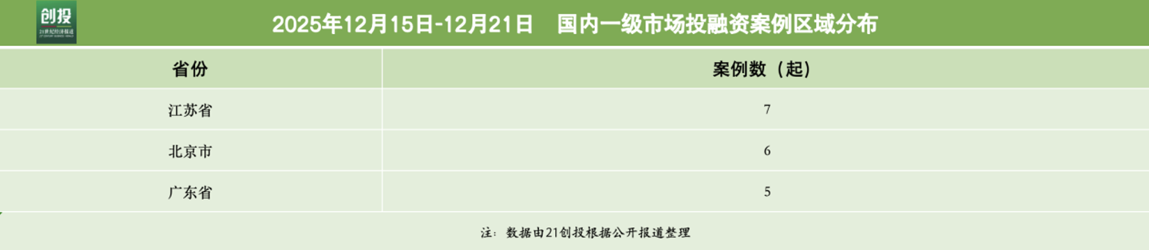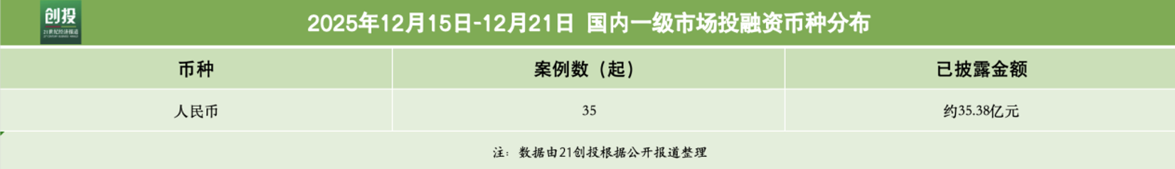 21创投不完全统计,2025年12月15日—12月21日,报告日期内国内一级市场发生融资事件35起。其中,有22笔融资披露了融资金额和币种信息,总规模约合人民币 35.38亿元。