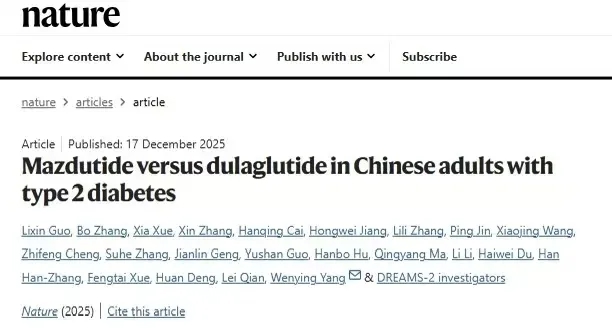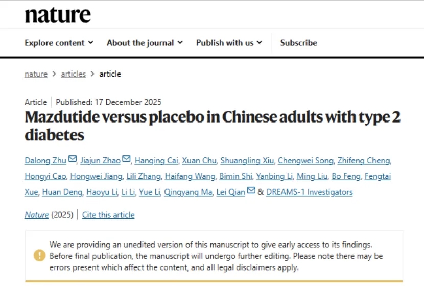 无独有偶。玛仕度肽在2型糖尿病患者中的单药治疗研究(DREAMS-1)、与口服降糖药联合使用的研究(DREAMS-2)两项成果(均基于中国患者的临床数据),北京时间18日在国际学术期刊《自然》发表,这也是该杂志创刊以来首次在代谢和内分泌疾病领域背靠背同步发表两项Ⅲ期临床研究成果。