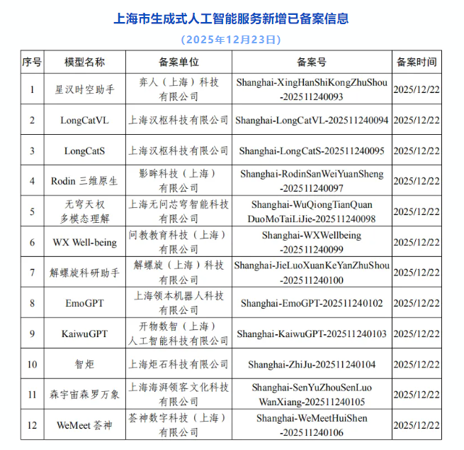 12月23日,据“网信上海”微信公众号消息,截至12月23日,上海市新增12款已完成备案的生成式人工智能服务,累计已完成128款生成式人工智能服务备案。