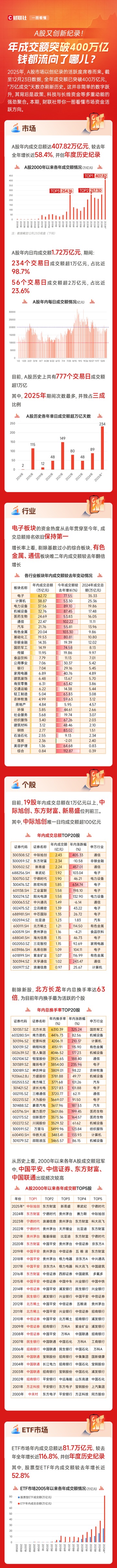 今年以来,A股市场交投活跃度显著提升。截至12月23日,全年累计成交额达407.82万亿元,较去年全年增长近58.4%,创下年度历史新高。