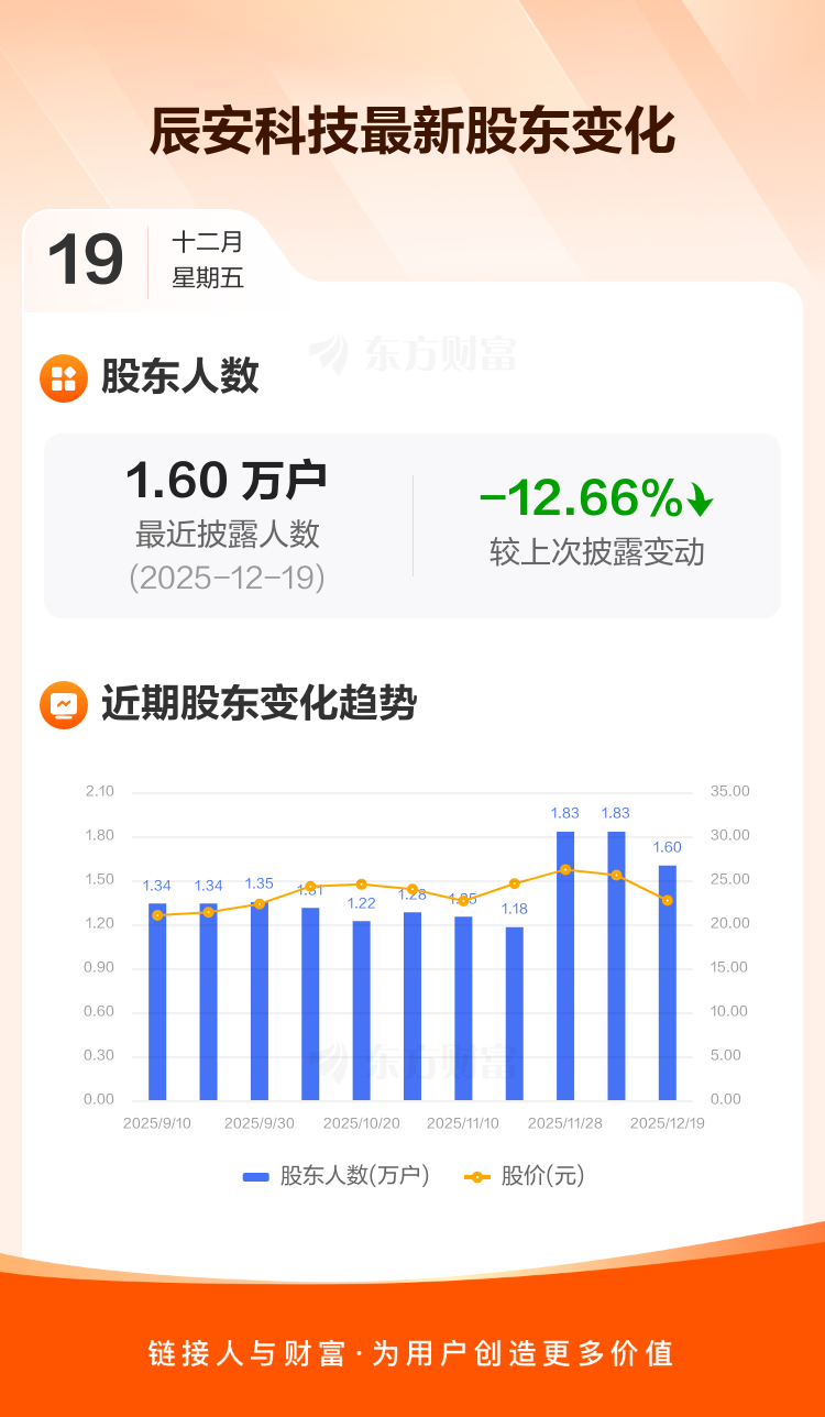 辰安科技最新披露数据显示,截至12月19日公司股东户数为1.60万户,较上期(2025年12月10日)减少2313户,降幅为12.66%。户均持有流通股数量由上期的1.27万股上升至1.46万股,户均持股金额由上期的32.51万元增加至33.04万元。