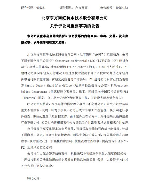 东方雨虹(002271)12月23日公告,公司近日获悉,公司下属美国全资子公司OYH Construction Materials LLC(简称“OYH建材公司”)疑遭电信诈骗,涉案金额约171.83万美元(约1211.8万人民币)。OYH建材公司在向总包方支付建设工程进度款时被犯罪分子入侵邮箱并伪造总包身份申请付款实施诈骗,在察觉到疑遭电信诈骗后,OYH建材公司已向当地警方哈里斯县治安官办公室和W伍德斯托克警察局报案,同时已向美国联邦调查局FBI(Houston)报案,公司将全力配合当地警方工作,争取最大限度避免损失。经初步核查,此次事件为偶发独立事件,不会对公司正常生产经营造成重大不利影响。同时,针对该事项,公司已成立专项工作组前往下属公司进行事件核查、善后处置及风险管控工作。