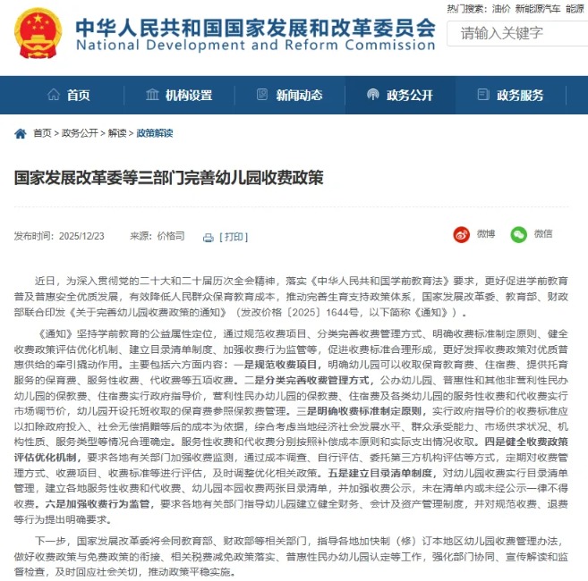 近日,为深入贯彻党的二十大和二十届历次全会精神,落实《中华人民共和国学前教育法》要求,更好促进学前教育普及普惠安全优质发展,有效降低人民群众保育教育成本,推动完善生育支持政策体系,国家发展改革委、教育部、财政部联合印发《关于完善幼儿园收费政策的通知》(发改价格〔2025〕1644号,以下简称《通知》)。
