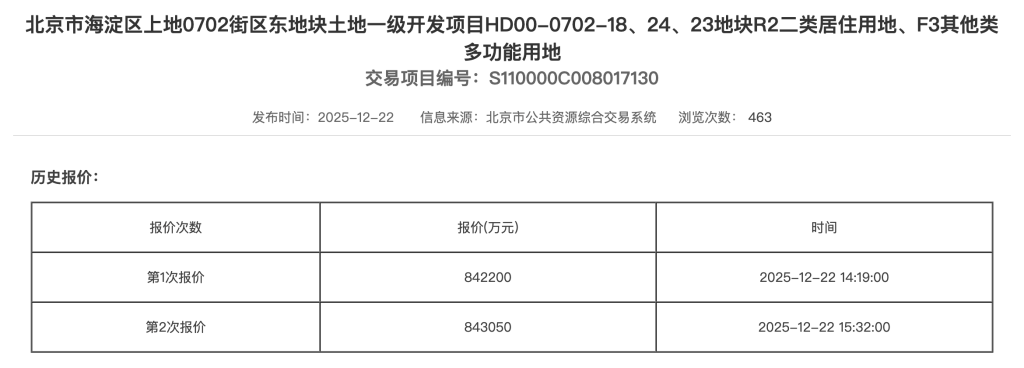 12月23日,北京土地市场迎来海淀区一宗涉宅用地出让,根据成交结果,该地块以0.4%的低溢价成交,成交总价84.56亿元。