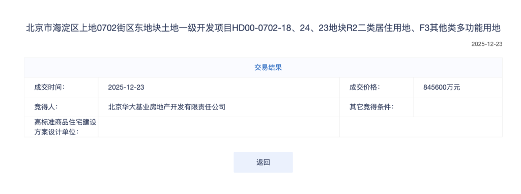 该地块开拍前已获两家房企报价,最终由海开控股旗下北京华大基业房地产开发有限责任公司以总价84.56亿元竞得该地块,成交综合楼面价约37517元/平方米,溢价率0.4%。天眼查信息显示,北京华大基业房地产开发有限责任公司由北京海开控股(集团)股份有限公司100%持股,后者是海淀区国资控股的区属一级监管企业。
