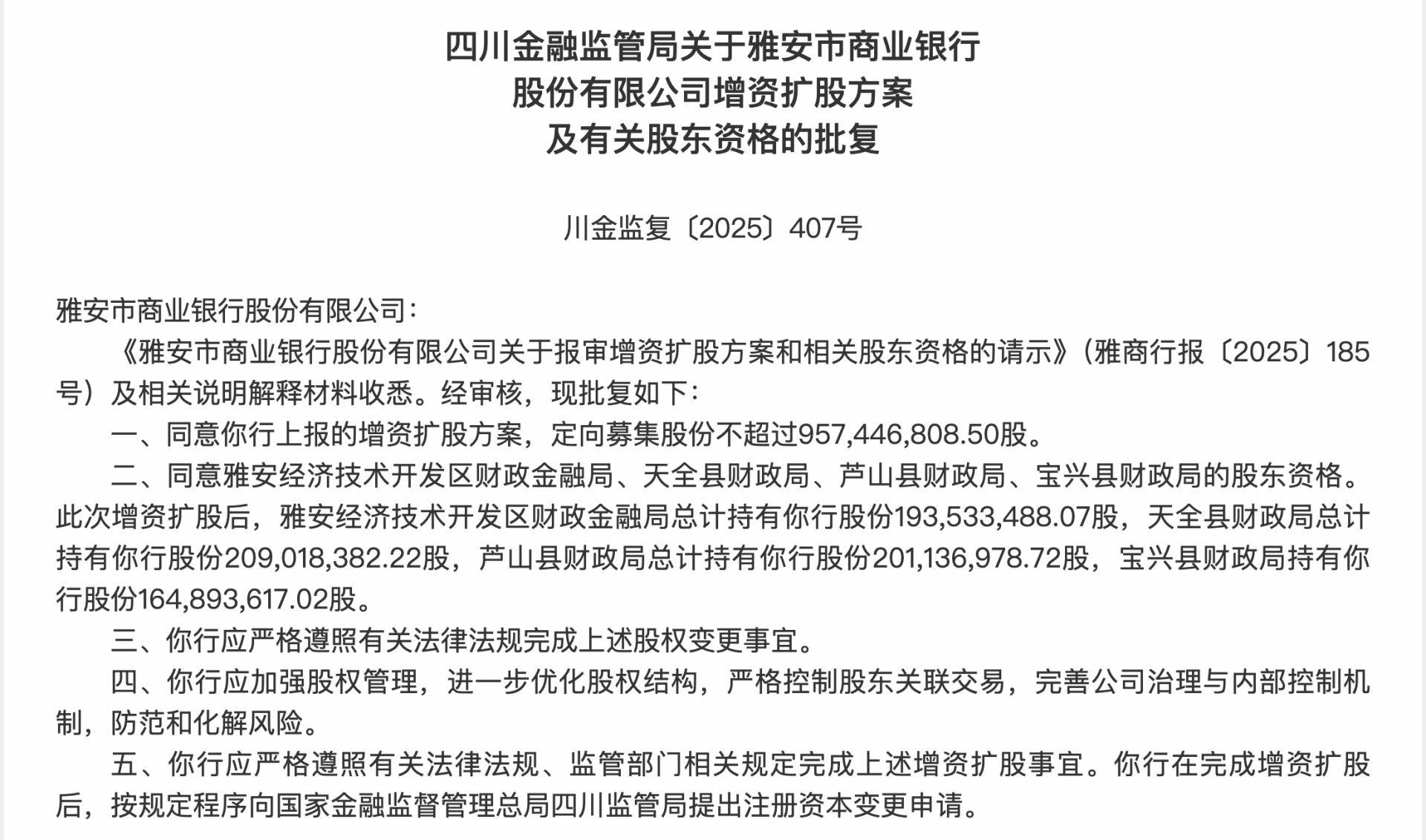 四川金融监管局的批复文件明确了雅安市商业银行此次增资扩股的具体方案。根据批复,该行获准定向募集不超过9.57亿股,并认可了四名新股东的股东资格。