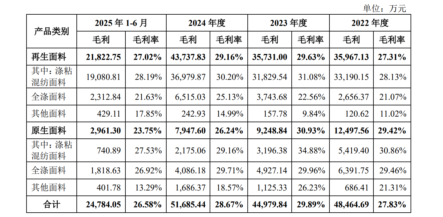 收入占比在提高,毛利率正逐渐下降。2023年福恩股份再生面料毛利率为29.6%,2025年上半年降至27%。