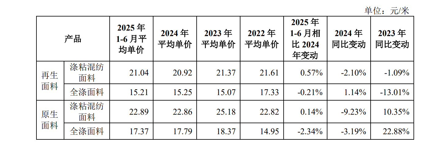 上游原材料涨价,福恩股份能否通过提价对冲成本的上涨呢?答案是不能。福恩股份再生面料主要包括两大产品——涤粘混纺面料和全涤面料。2022年,涤粘混纺面料平均单价为21.61元/米,2024年降至20.92元的最低价。2025年上半年,涤粘混纺面料21.04元/米的平均单价略有上涨,但涨幅不足一个百分点。