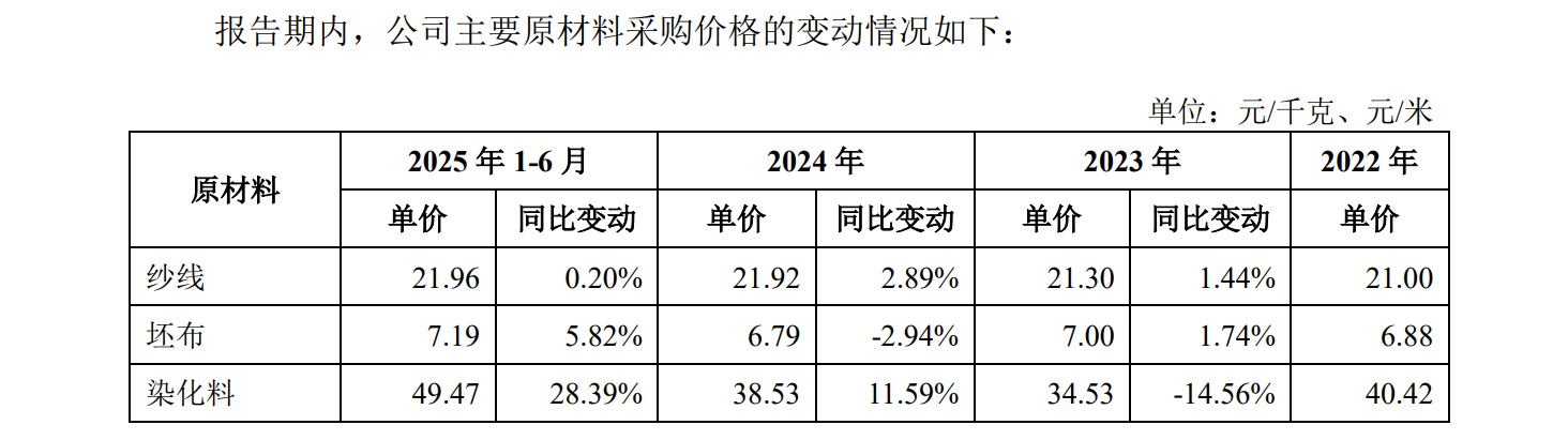 同时坯布从2022年的单价6.88元涨至2025年上半年的7.19元,同样是达到最高价,涨幅与纱线基本一致。
