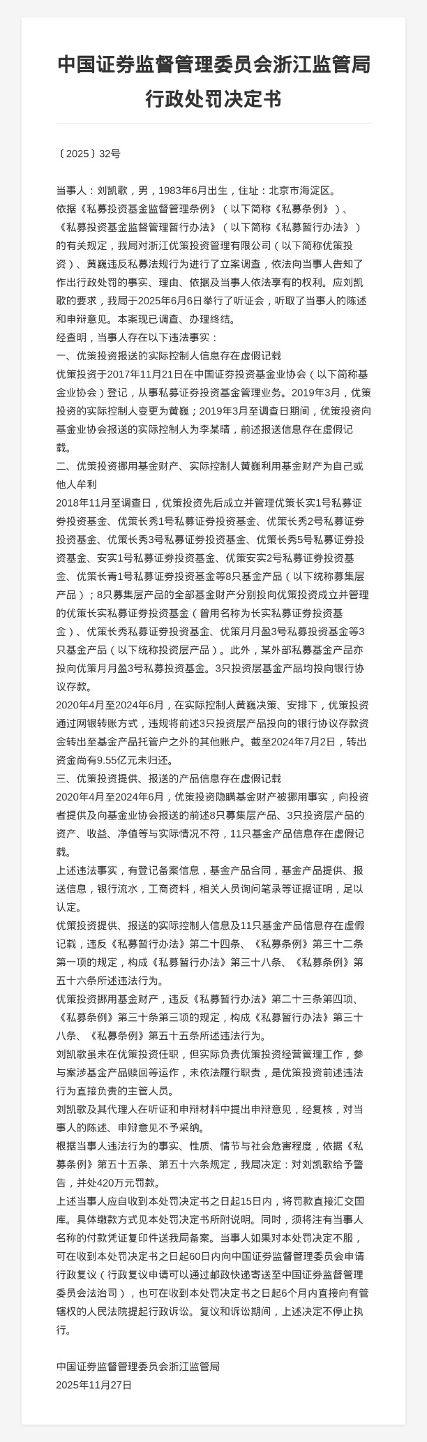 因此,中国证券监督管理委员会浙江监管局决定对刘凯歌给予警告,并处420万元罚款。