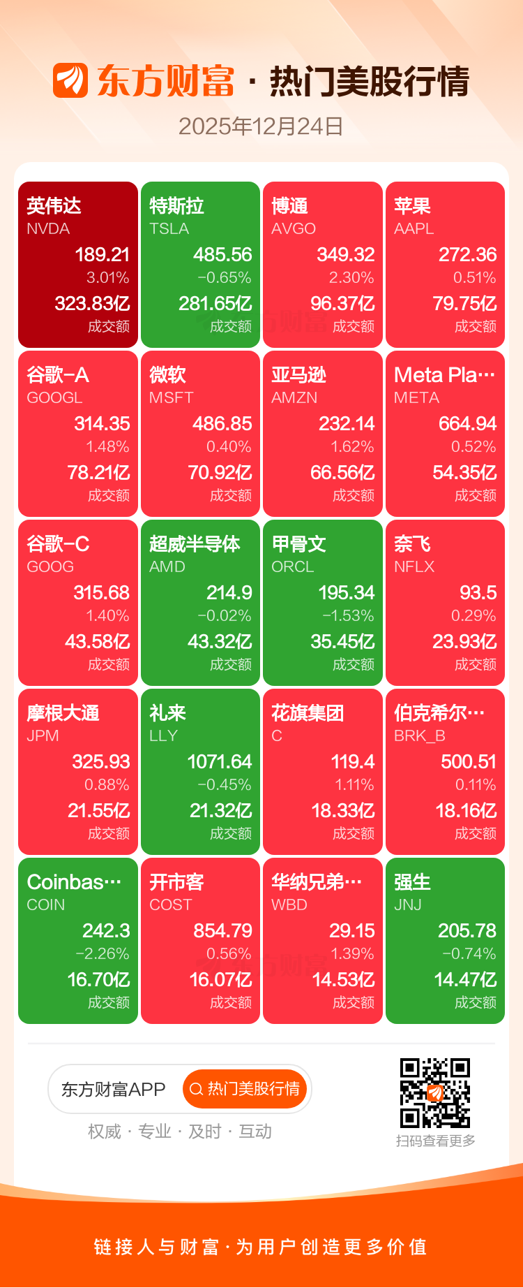 英伟达涨3.01%,特斯拉跌0.65%,博通涨2.30%,苹果涨0.51%,谷歌-A涨1.48%,微软涨0.40%,亚马逊涨1.62%,Meta Platforms Inc-A涨0.52%,谷歌-C涨1.40%,超威半导体跌0.02%。