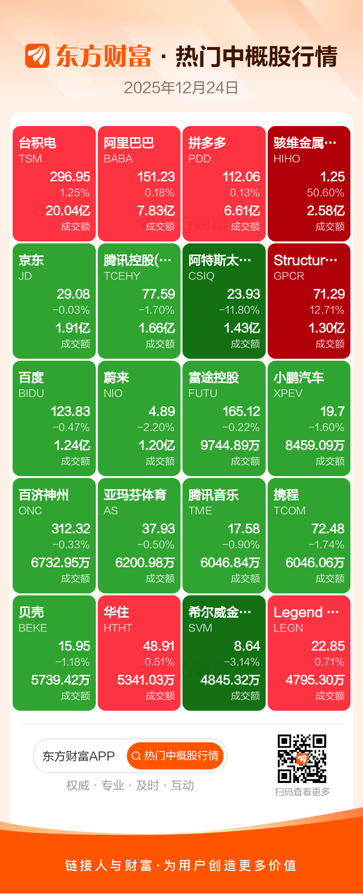 台积电涨1.25%,阿里巴巴涨0.18%,拼多多涨0.13%,骇维金属加工涨50.60%,京东跌0.03%,腾讯控股(ADR)跌1.70%,阿特斯太阳能跌11.80%,Structure Therapeutics Inc ADR涨12.71%,百度跌0.47%,蔚来跌2.20%。