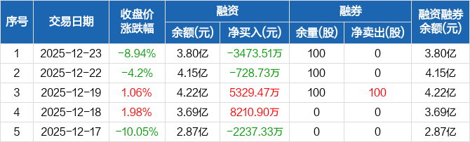 中超控股融资融券信息显示,2025年12月23日融资净偿还3473.51万元;融资余额3.8亿元,较前一日下降8.37%。
