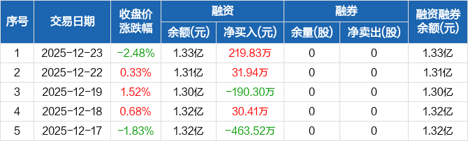 融资方面,当日融资买入1009.6万元,融资偿还789.77万元,融资净买入219.83万元。融券方面,融券卖出0股,融券偿还0股,融券余量0股,融券余额0元。融资融券余额合计1.33亿元。