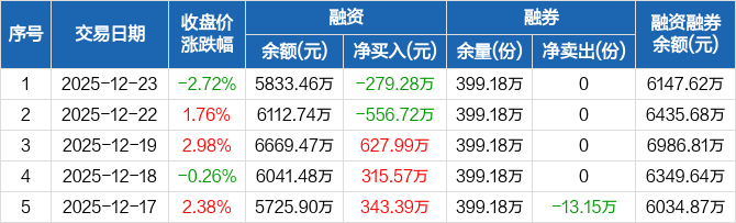 旅游ETF:融资净偿还279.28万元,融资余额5833.46万元(12-23)