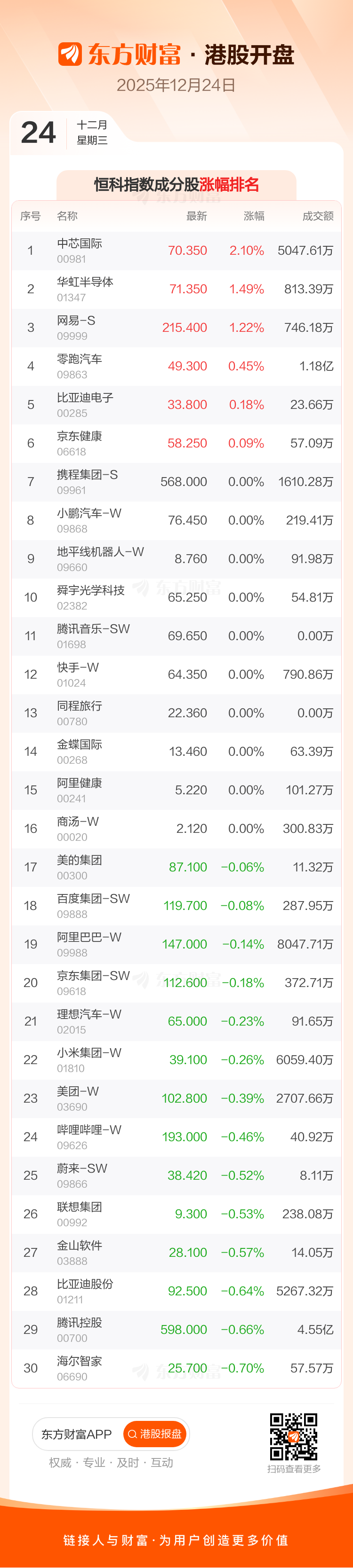 港股12月24日高开,恒生指数开盘报25780.09点,涨5.95点,涨幅0.02%;恒生科技指数开盘报5492.83点,涨3.94点,涨幅0.07%。恒生指数成分股中中芯国际、紫金矿业、华润啤酒涨幅居前,创科实业、石药集团、海底捞跌幅靠前。恒生科技指数成分股中中芯国际、华虹半导体、网易-S涨幅居前,海尔智家、腾讯控股、比亚迪股份跌幅靠前。