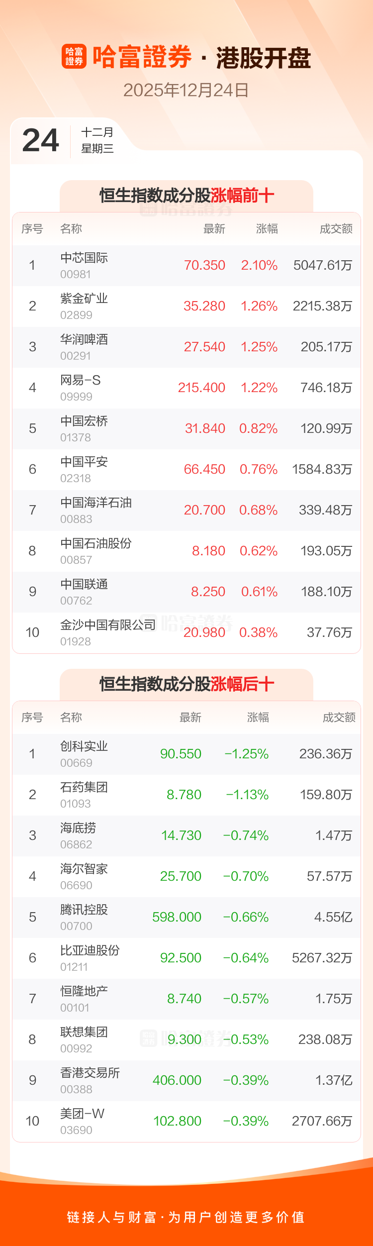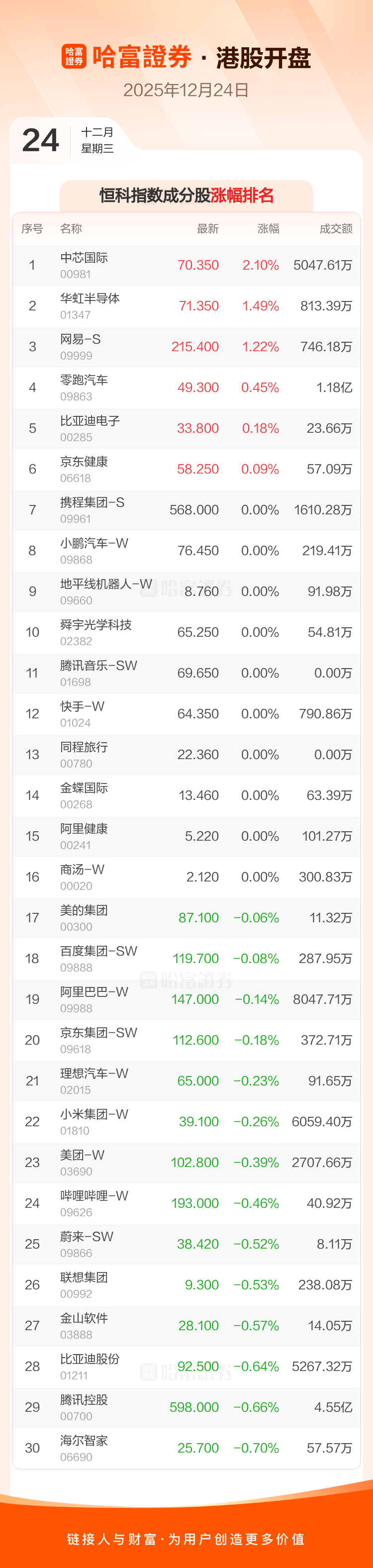 港股12月24日高开,恒生指数开盘报25780.09点,涨5.95点,涨幅0.02%;恒生科技指数开盘报5492.83点,涨3.94点,涨幅0.07%。恒生指数成分股中中芯国际、紫金矿业、华润啤酒涨幅居前,创科实业、石药集团、海底捞跌幅靠前。恒生科技指数成分股中中芯国际、华虹半导体、网易-S涨幅居前,海尔智家、腾讯控股、比亚迪股份跌幅靠前。