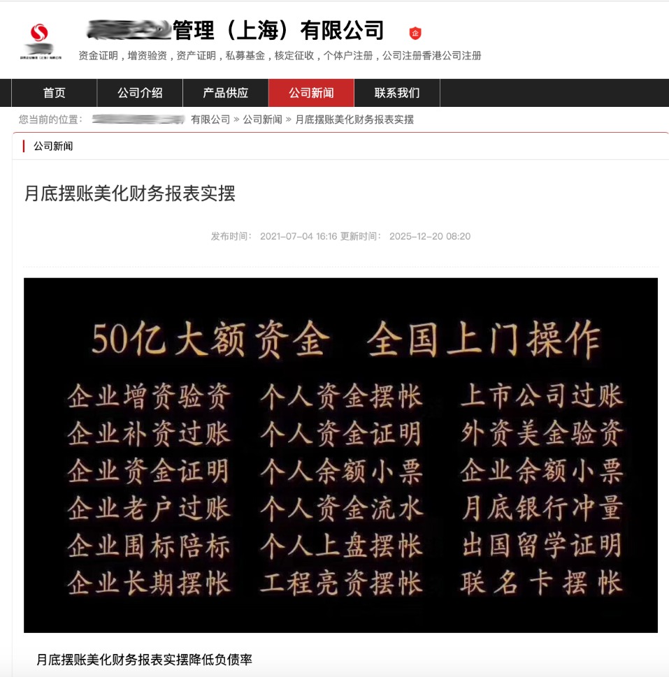 此外,记者在百度上搜索“摆账财报美化”,一家名为“某某企业管理(上海)有限公司”也在其网页上罗列“月底摆账、美化财务、实摆、降低负债率”等业务。记者通过网站上留下的电话号码加了对方微信,对方明确需要企业提供征信报告和“路径”,资金于2025年12月31日汇入,2026年1月4日转出,费用是1.9%。通过比对网站和“天眼查”所收录的该机构信息,二者高度一致。