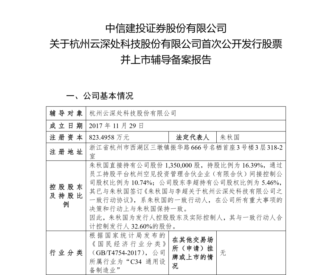 12月24日,据证监会公开发行辅导公示系统显示,“杭州六小龙”之一的杭州云深处科技股份有限公司(简称“云深处科技”)提交IPO(首次公开发行)辅导备案,由中信建投担任辅导机构。