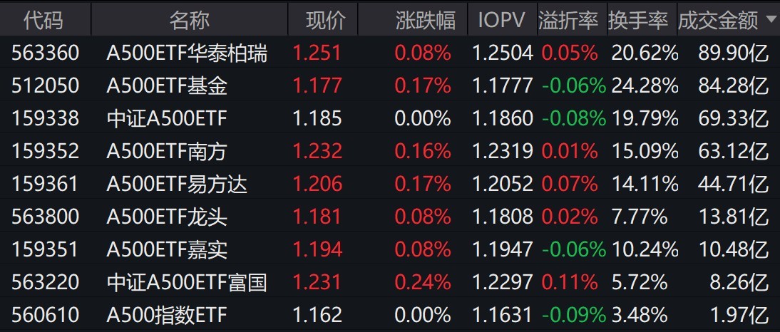 截至上午收盘,多只场内跟踪中证A500指数的ETF小幅上涨。其中,有9只中证A500相关ETF成交额超1亿元,2只超84亿元。A500ETF华泰柏瑞、A500ETF基金早盘成交额分别为89.9亿元、84.28亿元。