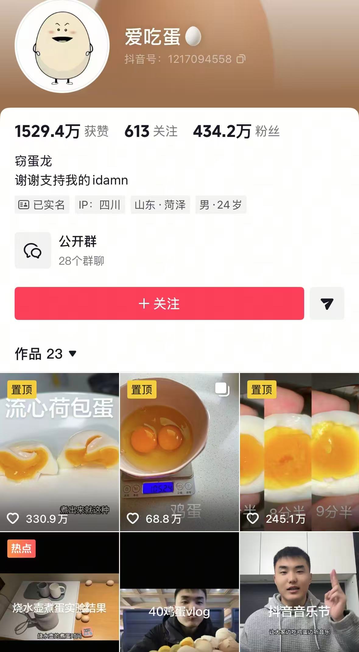 12月24日,界面新闻查询“爱吃蛋”的抖音平台账号,粉丝数为434.2万,获赞1529.4万,其中发布的“流心荷包蛋”的置顶视频点赞量330.9万。