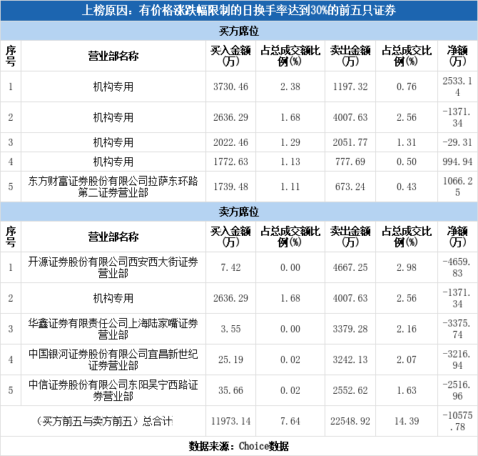 龙虎榜数据显示,今日共5个机构席位出现在龙虎榜单上,分别位列买一、买二、买三、买四、卖二,合计净买入2127.44万元,占该股今日总成交额的1.36%。除此之外还有天银机电、中材科技、宏达电子等37只个股榜单上出现了机构的身影,其中24家呈现机构净买入,获净买入最多的是天银机电,净买额为4.96亿元;13家呈现机构净卖出,其中遭净卖出最高的为章源钨业,净卖额为1.64亿元。