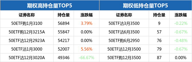 从持仓量来看,50ETF期权合约中,50ETF购1月3100持仓量最大,为56894张,期权全日上涨3.79%,报收0.0466元;持仓量最小的为50ETF沽3月3500,共计9张,期权全日下跌0.22%,报收0.4072元。