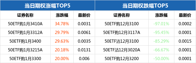 50ETF期权当日有180个合约正在交易。从涨跌幅来看,50ETF期权合约中,50ETF购1月3410A涨幅最大,为34.78%,报收0.0031元;50ETF购12月3100跌幅最大,为97.01%,报收0.0002元。
