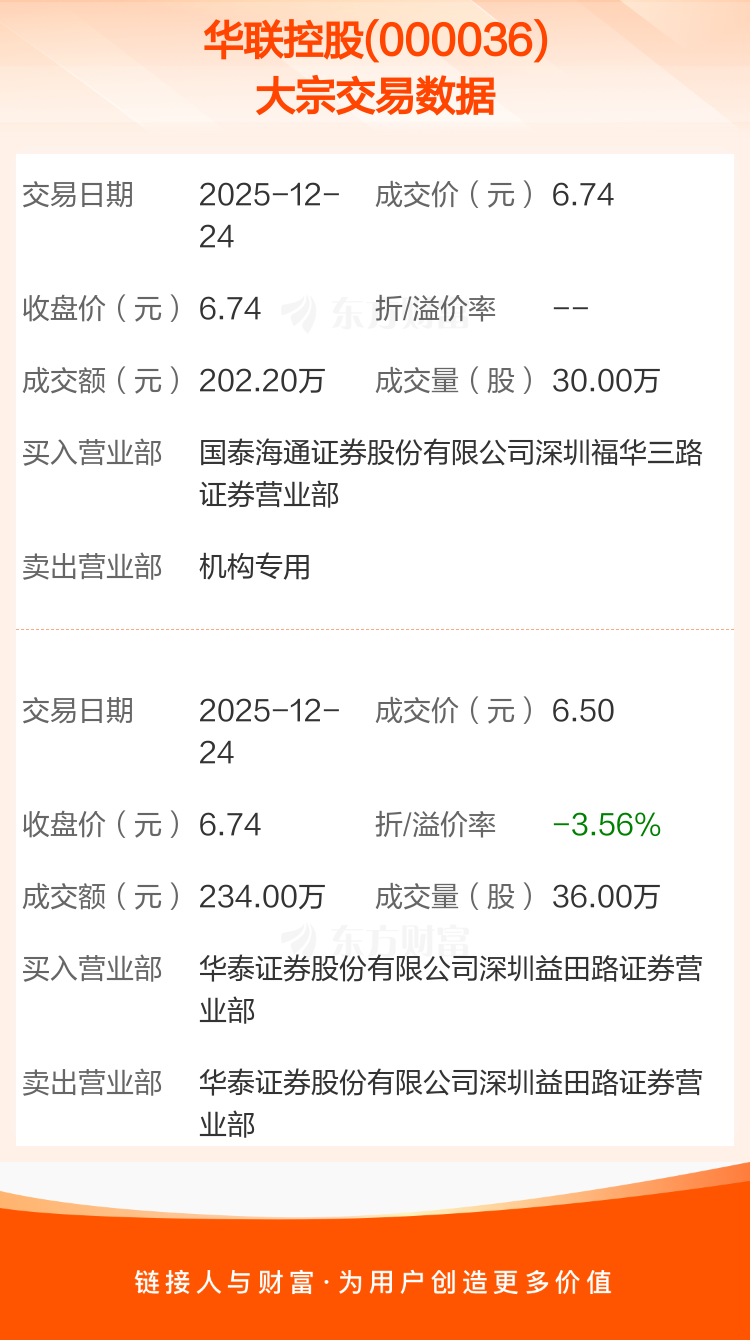 2025年12月24日,华联控股发生2笔大宗交易,共成交66.00万股,成交金额436.20万元,占其流通市值比例为0.05%。