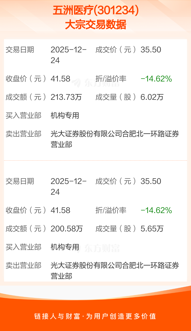 2025年12月24日,五洲医疗发生2笔大宗交易,共成交11.67万股,成交金额414.31万元,占其流通市值比例为0.15%。